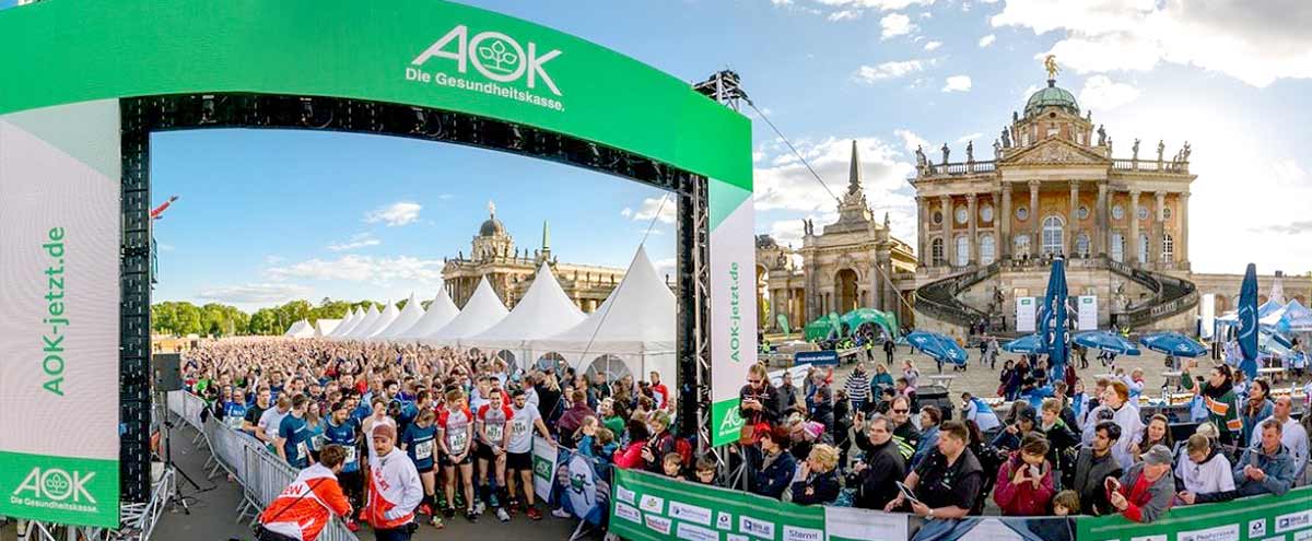 Vor wunderschöner, historischer Kulisse konnten sich die Sportler warm machen. Auf dem weitläufigen Areal zwischen der Universität Potsdam und dem Neuen Palais befanden sich Start- und Zielpunkt der fünf Kilometer langen Laufstrecke. Hier waren auch zahlreiche Stände zur Verpflegung, Kinderunterhaltung und eine Bühne aufgebaut, so dass der Firmenlauf gleich an ein Sommerfest erinnerte. Kinder übten sich in Wurfspielen, während die Erwachsenen vor und nach dem Lauf leckere Speisen und erfrischende Getränke zu sich nehmen konnten.